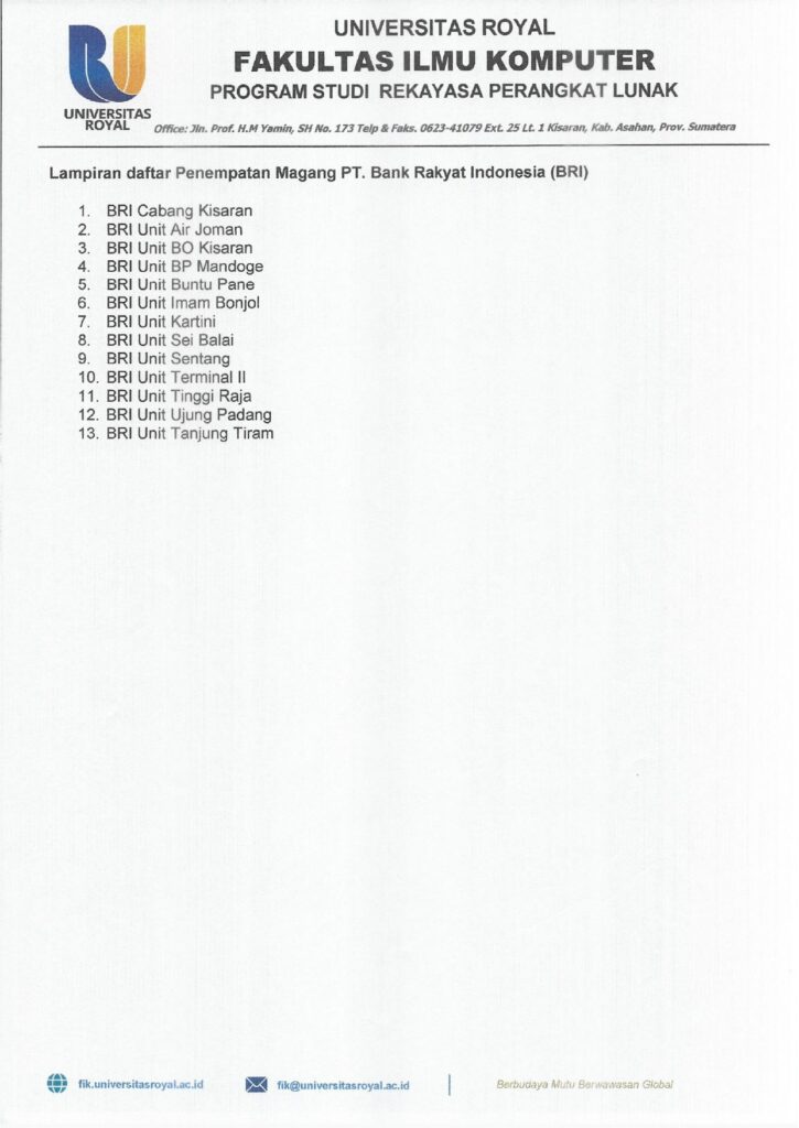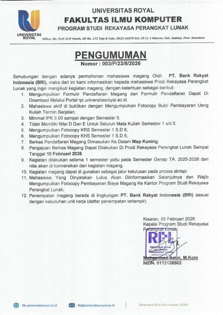 Pendaftaran magang Bank BRI tahun 2026 Program Studi Sistem Komputer telah dibuka. Mahasiswa yang memenuhi persyaratan dapat mendaftar secara langsung di Kantor Program Studi.