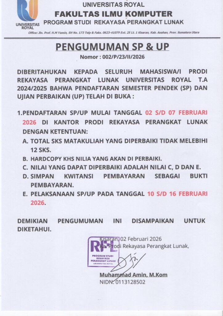 Program Studi Rekayasa Perangkat Lunak, Fakultas Ilmu Komputer Universitas Royal, mengumumkan kepada seluruh mahasiswa/i bahwa pendaftaran Semester Pendek (SP) dan Ujian Perbaikan (UP) Tahun Akademik 2024/2025 telah dibuka.
